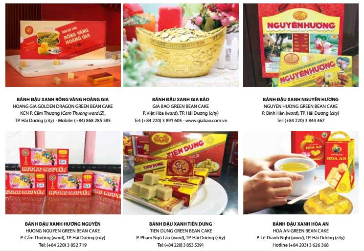 Nguyên Hương: Thương hiệu bánh đậu xanh Nguyên Hương ra đời năm 1986, đến nay cũng chỉ có một đại lý bán lẻ duy nhất là số 68 Trần Hưng Đạo, thành phố Hải Dương. Điểm đặc biệt của bánh đậu xanh Nguyên Hương là bánh được chú trọng vào việc gìn giữ vị thanh mát, trong lành của đỗ xanh. Chính vì thế lượng đường sử dụng trong bánh cũng phải được điều chỉnh để vị ngọt không át đi hương vị đặc trưng của đỗ xanh. Ngay cả thiết kế bao bì của bánh đậu xanh Nguyên Hương cũng được thiết kế mang nét đặc trưng của Việt Nam có hình ảnh ngôi bông sen. Thêm một điểm cộng nữa cho thương hiệu này là quá trình sản xuất không sử dụng chất bảo quản, vì vậy bánh chỉ có hạn sử dụng 2 - 3 tháng. Bánh được thiết kế với nhiều quy cách đóng gói khác nhau vì vậy du khách có thêm lựa chọn khi mua làm quà biếu, tặng.