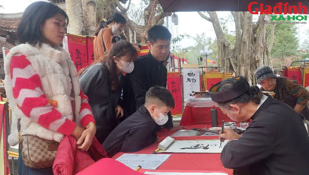 Nhiều du khách sau khi tham quan, chiêm bái đền Tranh xong, mọi người ra xin chữ đầu năm mang về. Ảnh: Đ.Tùy.